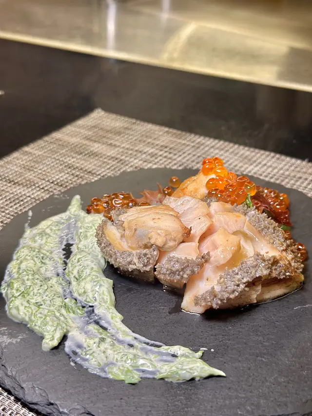 南非兩頭鮑魚勁生猛,未煮仲郁嚟郁去,師傅成個煮食過程都好治癒,火候時間掌握得啱啱好,好有彈性,蟹籽嘅鹹香同海鮮好夾,最欣賞師傅用忌廉海苔汁配搭非常出色。