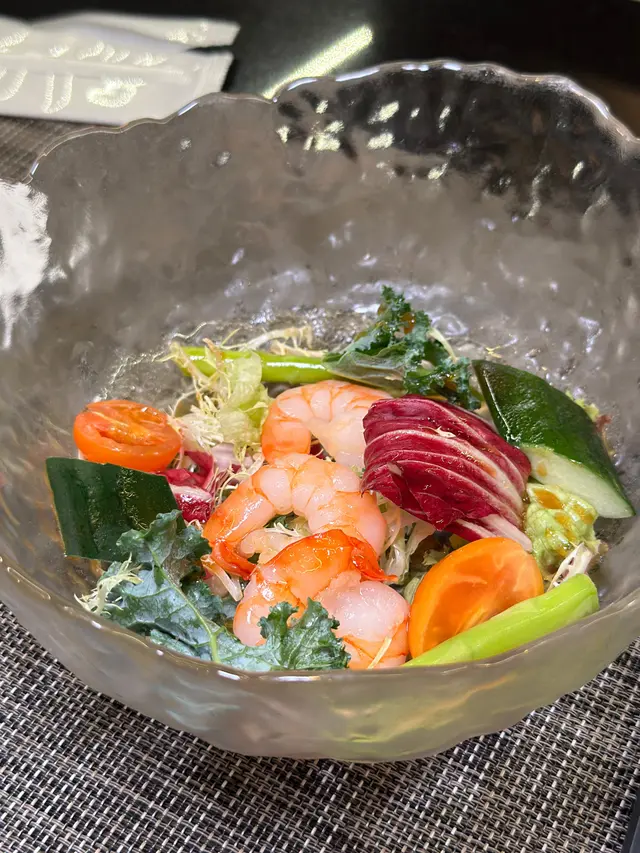 首先有前菜沙律比我想像中大份,日本入口蔬菜加三隻勁爽口嘅海蝦真係冇得輸,加上柚子醋調味,好開胃💛