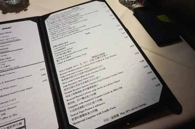 散叫固然隨心所慾,但晚市套餐則相對點都喺划算啲,5道菜晚餐(前菜、頭盤、湯、招牌菜、是日甜品 / 啡茶),定價非常進取,由$468-498 + 10%,所以,一對情侶嚟食番餐就已經成千銀落樓。究竟抵唔抵食,就要視乎番食物嘅質素。