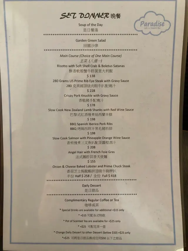 看看Menu,食物種類都有好多選擇,單是晚餐就有八選一,但假如set dinner唔合口味,還有其他主菜、意粉、飯,小食和All day breakfast⋯⋯等散叫,部分仲可以加錢升級做套餐,客人可以有更多選擇。