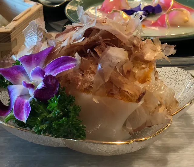 金絲海皇脆網腸,腸粉厚度適中,內裏的脆網很鬆脆,以西式芫荽丶鮮花伴碟,提升食客的視覺享受