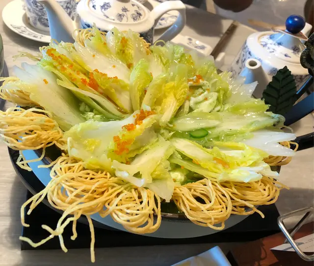 碧綠蟹肉蛋白炸雀巢(主菜),打卡一流,味道亦十分不錯,以銀川菜(花型)配上蟹子,下面麵(雀巢)托底,最下面是蟹肉蛋白,侍應們訓練有素,等待客人拍照完畢,便細心把銀川菜放平,把麵分成6-8份予食客享用