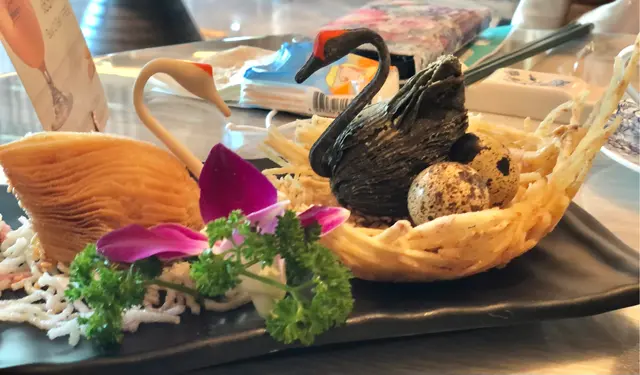 黑白天鵝(甜品),也是店內打卡點心之一,天鵝用酥皮製成,餡料是芝蔴丶杏仁,雀巢用芋頭條製作,還有兩粒鵪鶉蛋