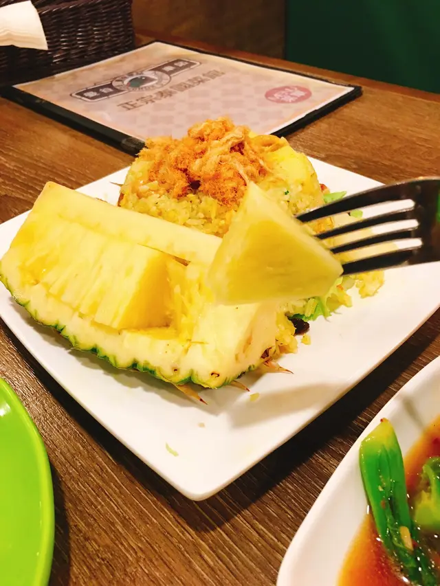 有別於一般菠蘿炒飯用上的半殼菠蘿,佢係成條切左粒粒的菠蘿上的。鮮甜之餘,仲食得好方便。