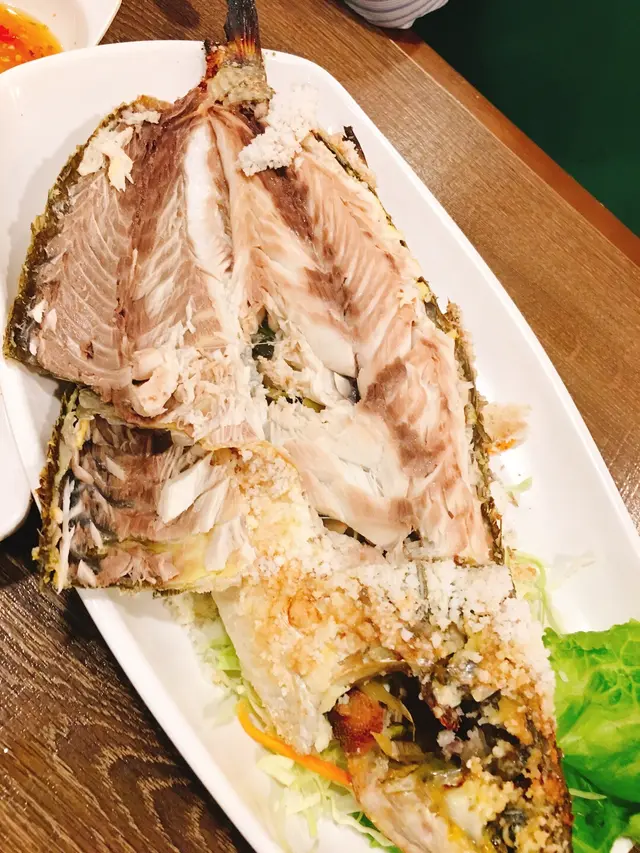 好大條,表面舖滿鹽霜,仲用左香茅、薑葱、蒜等釀入魚腮位,增加香味。