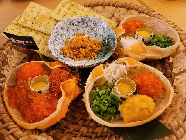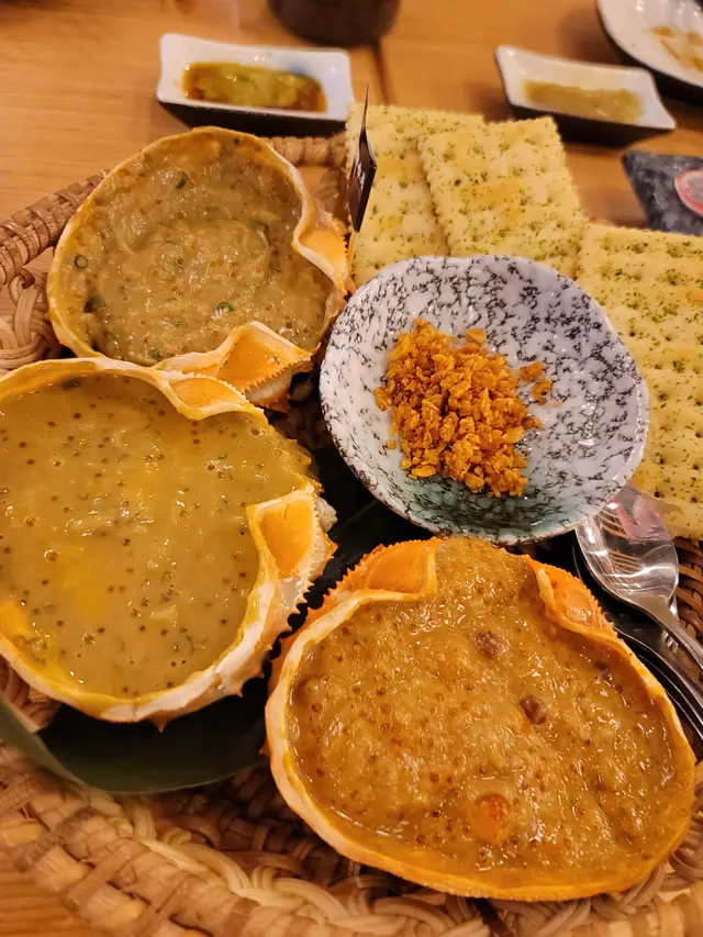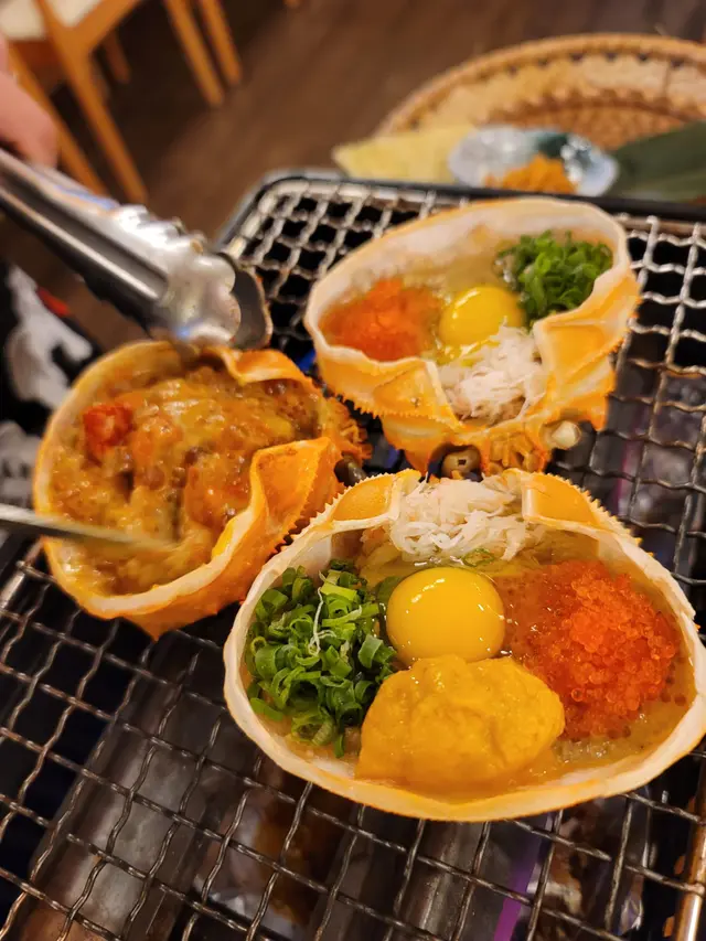 首先黎個黑門令蟹味噌甲羅燒,海膽蟹味噌甲羅燒同赤鬼蟹味噌甲羅燒,顏色望落已經好吸引,店員細心講解食法同先後次序,由啖味嘅黑門令食先,最後先食赤鬼就可以試真啲個味道。