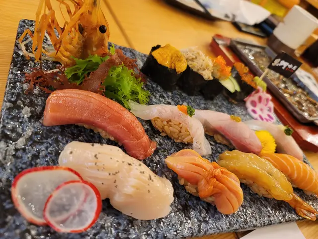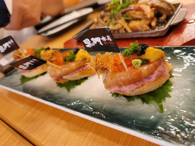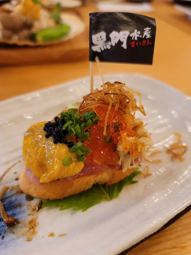 黑門令大漁魚子醬脆脆包更令人大開眼界。口感豐富,香脆嘅法包上面材料豐富,有新鮮蟹肉,鮮甜嘅海膽,魚子,魚子醬,吞拿魚蓉同蟹子,配上炸香左嘅乾蔥,多重口感,令人回味。