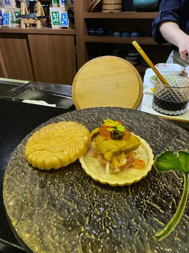 7. 吞拿魚蓉:以最中餅盛載,伴上北海道紫海膽、黑魚籽和三文魚籽,口感和味道非常豐富。