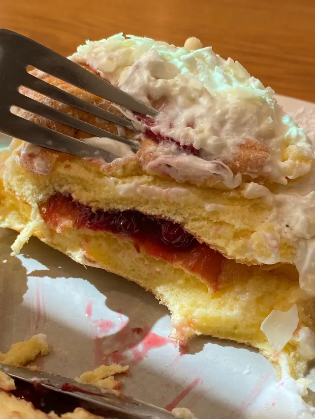 我叫咗白朱古力草莓疏乎厘班戟,呢個好明顯係打卡用,要自己拉起營造熔岩效果,外型已經好特別,味道都唔錯,以為白朱古力好甜,原來都唔甜,加埋士多啤梨一齊色感覺好清新。捐軟綿綿嘅忌廉口感好豐富,入邊一家有少少白色朱古力脆粒,對比感好強,期間限定值得試吓。