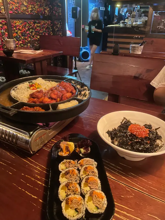份量勁多!2-3人share都夠食!如果係4個女仔食都ok😆 有勁多炒雞同芝士🧀,爐邊仲有蛋!泡菜,菠蘿同紫菜飯。