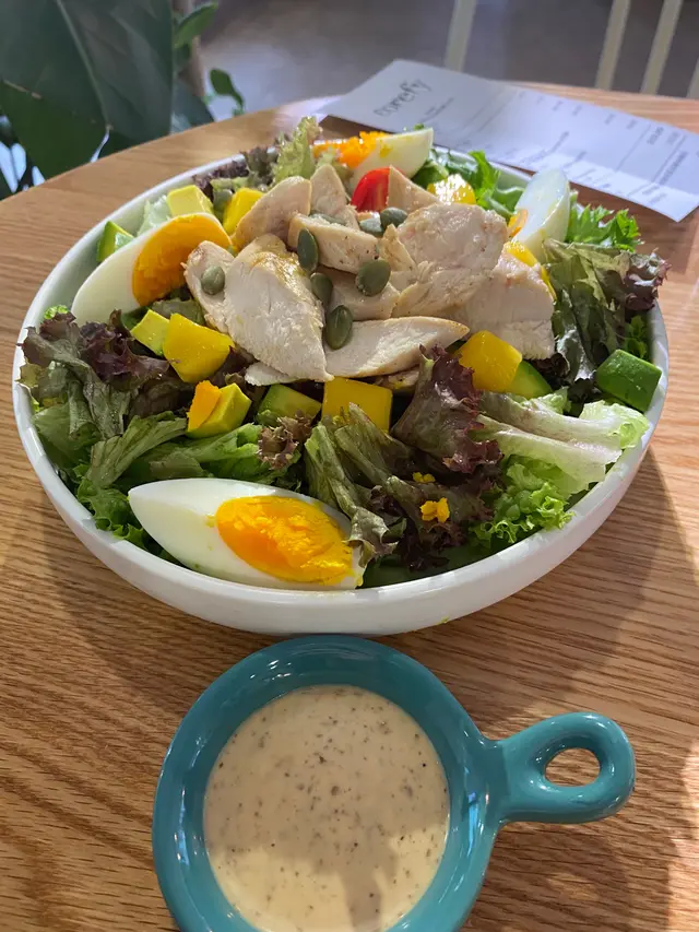 偷得浮生 EllenHui1018Level 42022-03-3045 views Follow 今日終於可以同肥仔出去搵食,來了這間Cafe。Cafe位於二樓,上去要花些腳骨力。這裡很大,門口有個帳篷打卡位,另外裡面有個Area是日式榻榻米風格,都幾特別。我地下午茶時段來,叫了牛油果雞胸沙律同個抹茶Cake,再share熱養生花茶。想不到沙律味道很不錯,雞胸很滑身,吃起來不會覺得很多渣,沙律菜很新鮮,配芝麻醬,味道更好。抹茶芝士蛋糕,肥仔好喜歡,只因我不太好芝士,所以覺得芝士味很濃,希望芝士和抹茶的朋友不要錯過。花茶外型特別,裡面泡著菊花、杞子、玫瑰,喝起來很舒服,可以Tim飲。The above review is the personal opinion of a user which does not represent OpenRice's point of view.1Share偷得浮生 Corefy https://s.openrice.com/QrKT0OLP200Report Post Ratings5Taste4Decor4Service4Hygiene3ValueDining MethodDine In