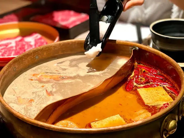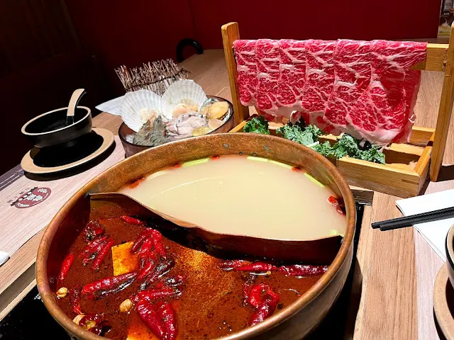 我地叫左鴛鴦鍋,一邊御膳麻辣鍋另一邊藥膳紅燒牛骨鍋。
