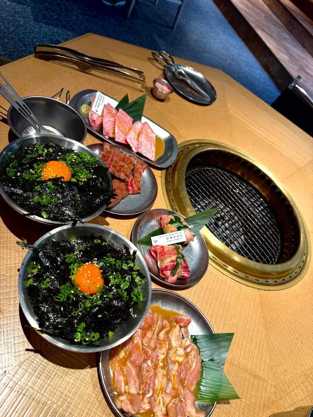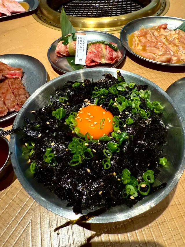 日本珍珠米上灑滿海苔絲,再加上新鮮的日本生蛋黃,是燒肉必配之選!