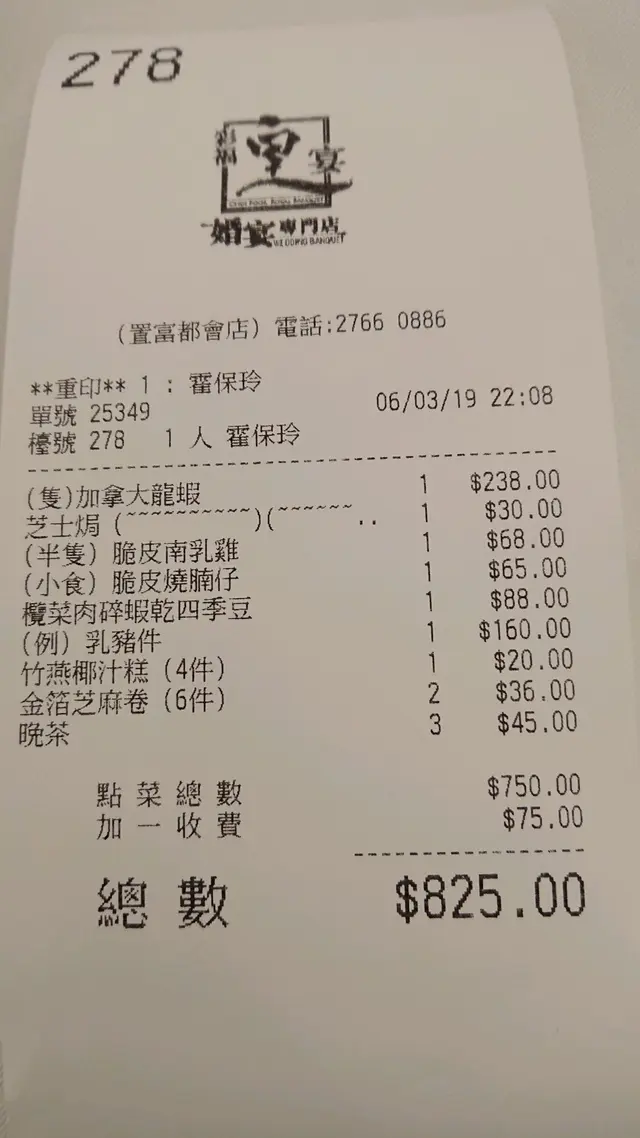 當晚我們一行四人,大家都想吃多幾款不同的菜式,但怕吃不下浪費食物,所以點了一些份量相對較少的。在一人點一款之下我選了名貴的乳豬件,其餘的都是由朋友揀選,差不多全部都是香脆的款式,幸好有普洱茶消膩。