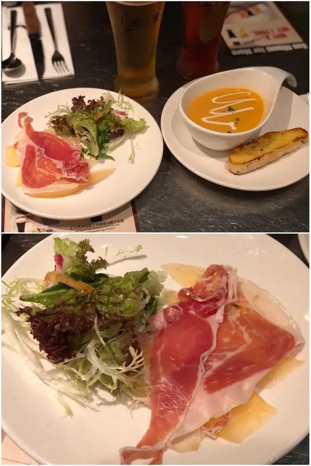 揀左set dinner , 蕃茄餐湯已經相當有水準,蒜蓉包烘烤得香脆,加左個輕怡小點, Parma Ham 伴蜜瓜, Parma Ham 本身充滿鹹香,蜜瓜鮮甜多汁,雖然是原材料製作,但見餐廳重視食材的挑選