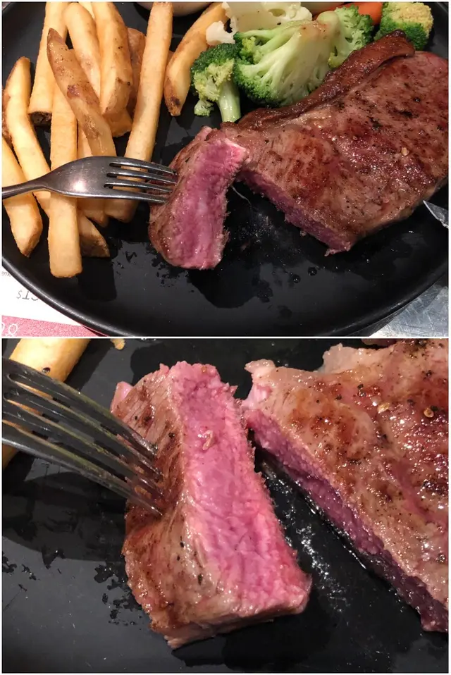西冷牛扒五成熟,厚件鐵板上,煎封嘅牛扒表層微微焦,切開是粉嫩的五成熟,要讚的是廚師嘅巧手,完全做得到五成的程度,肉質具彈性,牛味濃郁,黑椒汁無需動用已很好味