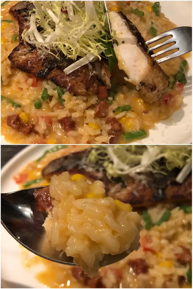 原條鱸魚啖啖肉,脆皮乾身,沒見多餘嘅油份,真正做到外脆內軟,意大利飯creamy 入味,配合了風乾嘅香腸,新鮮豆豆粒,色彩豐富,令你在吃飯之際,同時享受到爽脆的口感。