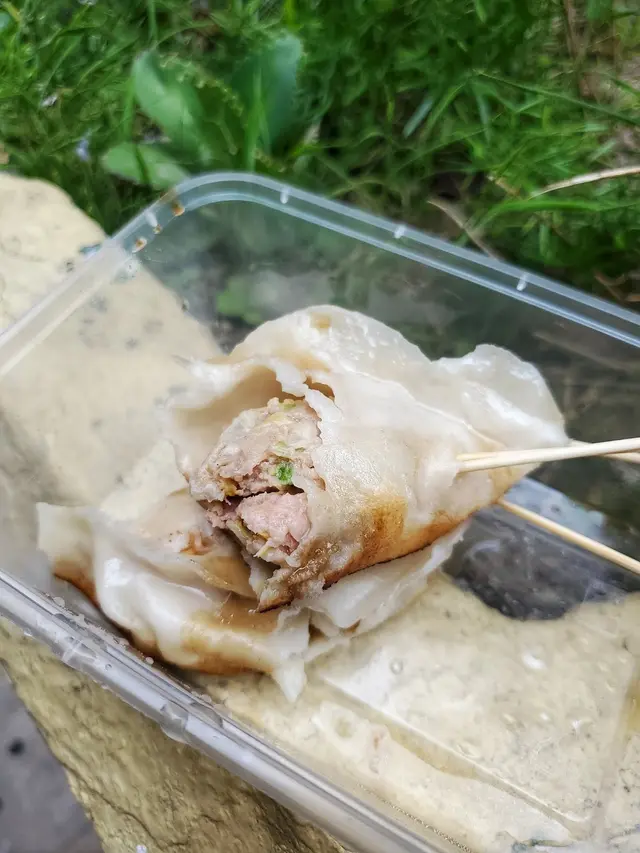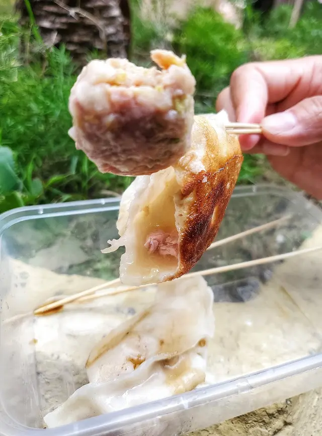 肉餡的湯汁不豐,富有淡淡的酒香,跟鍋貼的味道不太一樣!