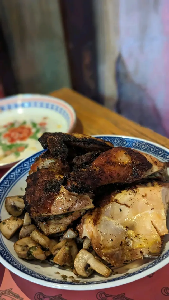 磨菇又香又爽口。 雞塊稍有點燒焦,所以有啲苦澀。