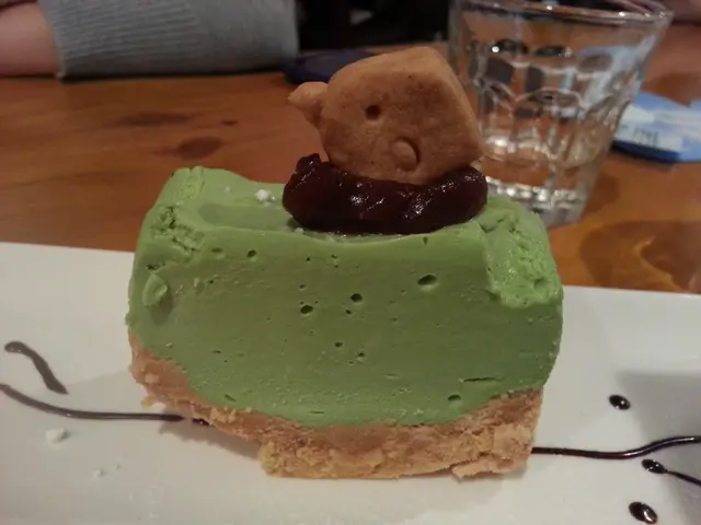 綠茶芝士蛋榚 - 件蛋榚上面有隻雞係牛油餅乾製,好cute, 雞頭下面墊住紅荳茸,再下面係少少忌廉,整件蛋榚綠茶味道好香,芝士不會太甜但真係細件左啲啲