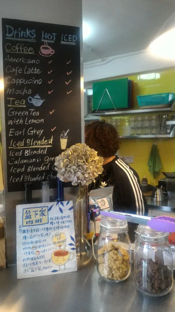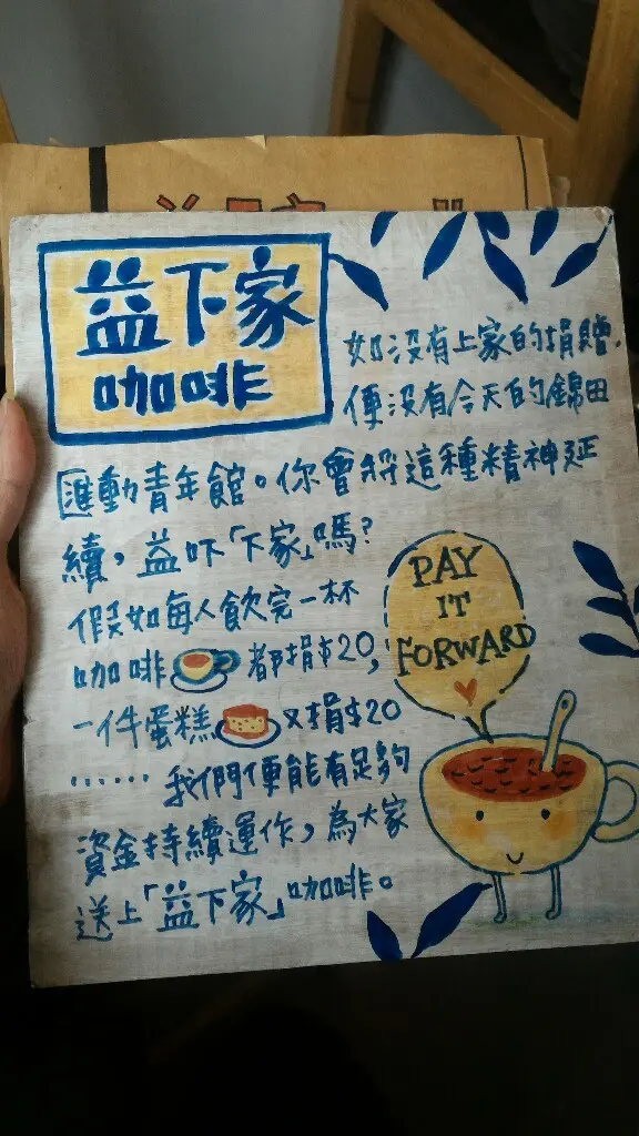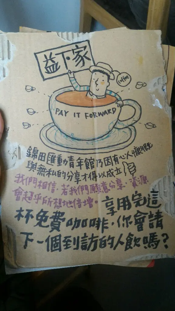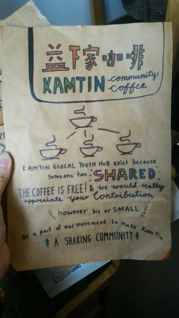 入面主要係提供coffee, 仲有少量的茶和小食, 全部都係免費既, 營運係靠大家自發捐錢, 有個叫益下家的設計, 鼓勵用餐者每次捐出$20請下一位朋友飲咖啡。