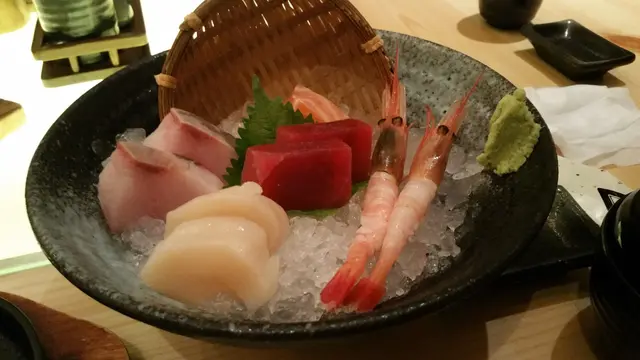 首先送來的是套餐的沙津及味噌湯。味噌湯很濃,內裡有著少許的菜和魚卷,也很好喝。沙津則沒太大的特別。送餐的時間也頗為迅速。不消10分鐘,就送來了刺身拼盤了。刺身拼盤有著五款的刺身,包括吞拿魚,甜蝦,帶子和三文魚。魚刺身來得厚厚的,口感十足,入口即融。與平常的日式壽司刺身店相比,味道來得比較鮮,令人有著真材實料的印象。