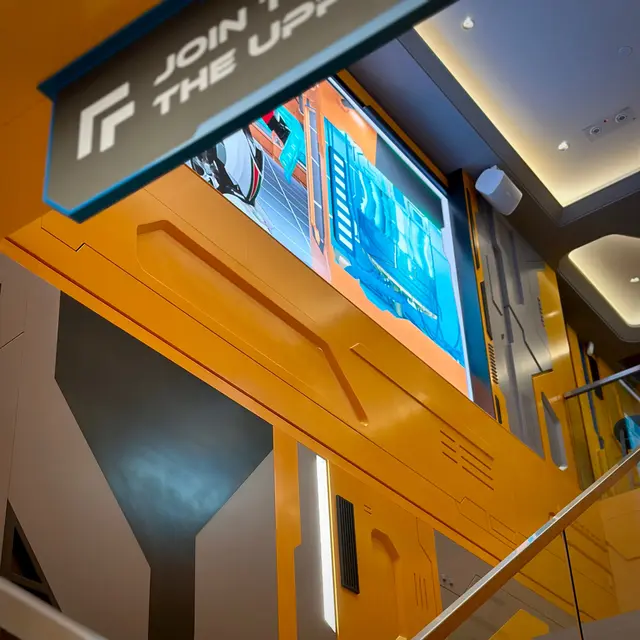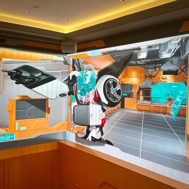 餐廳門面為立體飛船引擎 將裸眼3D 螢幕結合實體建築之中 更加有同步燈光和音效 獨一無二呢!