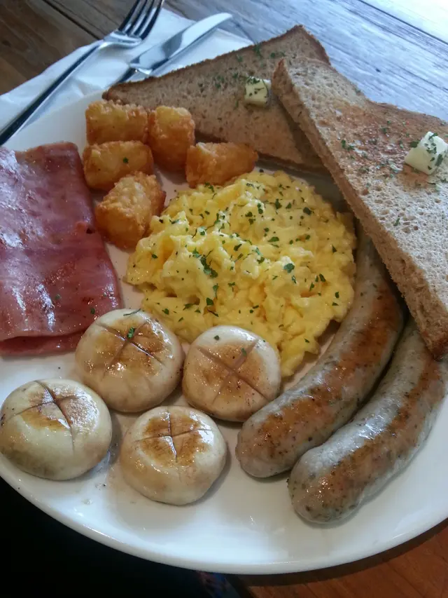 炒雞蛋, sausage, mushroom, 火腿, 都合格, 薯寶就一般超市買到的, 最值得一提係麵包, ceres 本身係好多人幫襯的麵包店, 麵包有一定的水準, 所以塊多士係個全日早餐的靈魂