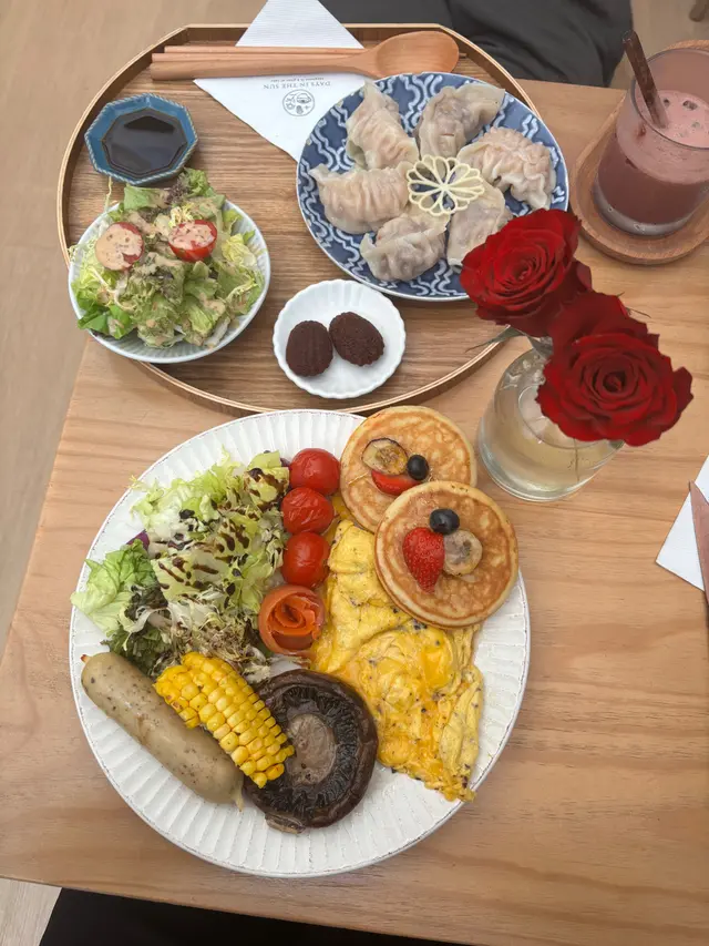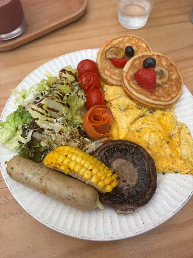 全日早餐,呢個套餐有蛋、煙肉、腸仔等等,蛋煎得兩面金黃,蛋黃半熟流心,煙肉脆邊嫩內,烤得香脆,腸仔汁水鎖住,咬落彈牙,配多士烤得鬆化,食落組合經典,味道平衡,份量充實,啱晒早午餐。🍳
