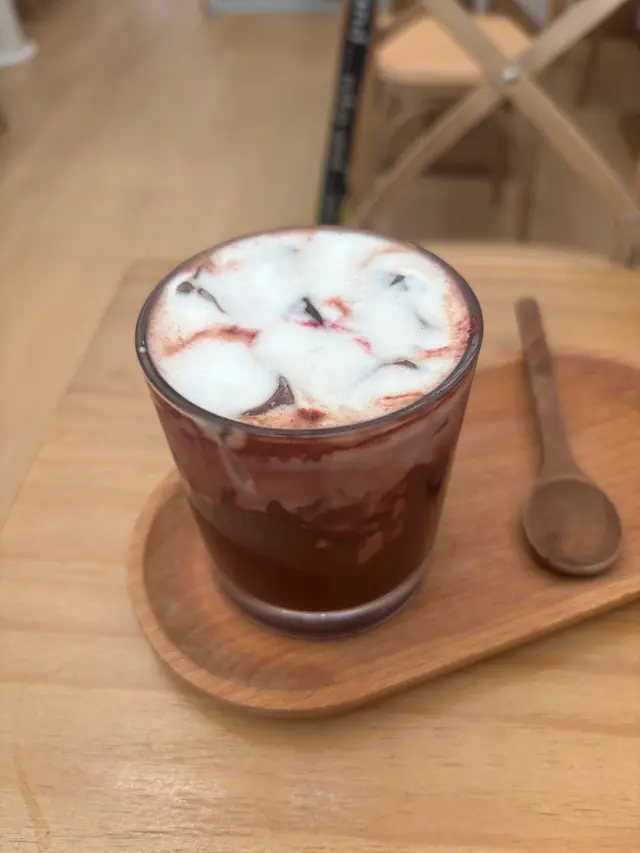 紅絲絨朱古力,飲品用紅絲絨基底混朱古力,熱或冰都得,朱古力濃郁滑順,紅絲絨帶少少酸甜果味,奶泡打得細膩,飲落順喉唔膩,溫度控制好,配蛋糕沖淡甜度,朱古力味突出得嚟唔過火。🍫