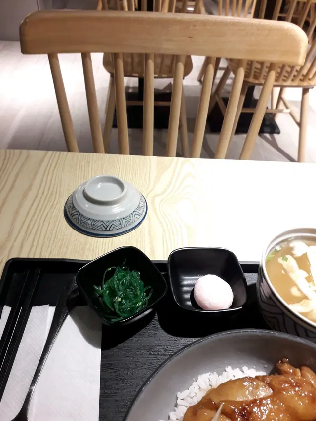 結果我終於成功在「魚木日台美食」裡面,點到一份主要食材都是來自「雞肉」和「白飯」,至於整體味道則是十分甜美和濃厚的「照燒汁雞排丼」,配小食「唐揚炸雞」跟「味噌湯」和餐前小食「中華沙律」晚餐。