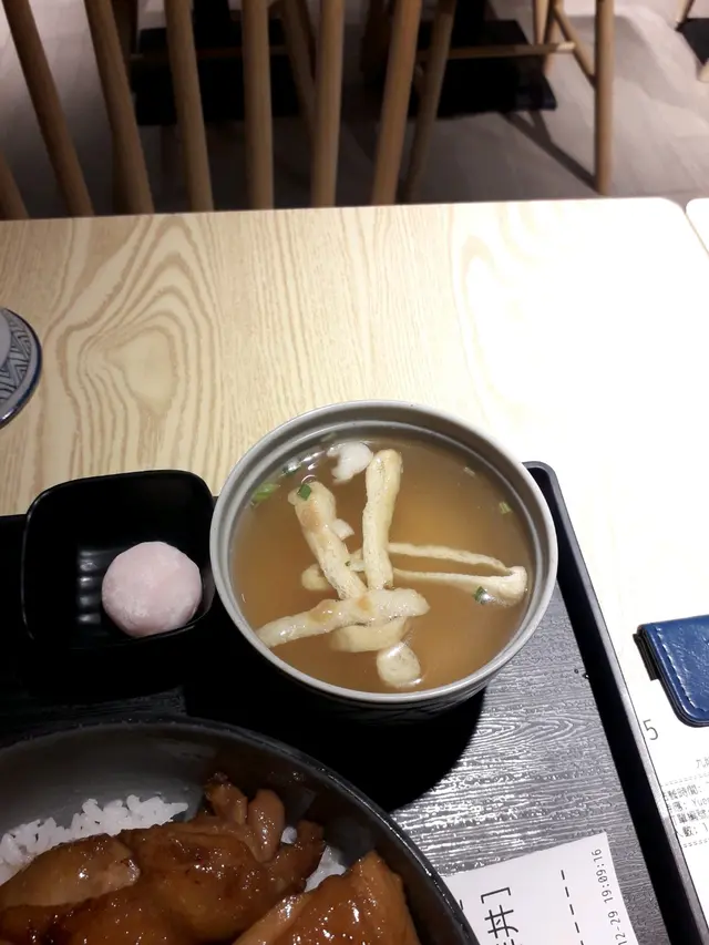 至於套餐餐湯「味噌湯」裡面的鹹味感覺算是頗為濃厚,而且「味噌湯」裡面有一塊口感也算是頗為耐嚼,外表呈現綠油油一片的配料「海帶」。