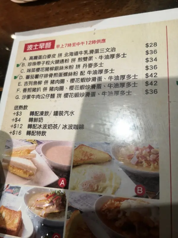 ~典型冰室迷~ ALZKLevel 22019-02-04281 views Follow 身為港人, 特別鍾意茶餐廳, 更要一朝一港式奶茶才能叫訓醒~波士冰室新間於荃灣千色店, 而早餐更直至中午12點~ 行經附近, 當然要試下有丹麥多士的早餐啦~ 點了早餐C: 味菜櫻花豬柳銀絲米粉 配 丹麥多士 + 熱奶茶 - 味菜櫻花豬柳銀絲米粉: 湯底有味, 不是淡的, 而配上味菜甜甜酸酸, 個人喜愛味菜, 所以滿意湯底。米粉更有掛湯效果, 所以啖啖滿足。豬柳咬起來肉質算滑, 可惜頗乾- 丹麥多士 : 手慼鬆軟, 口感酥軟, 充滿牛油香, 加上熱培, 好味~~- 熱奶茶: 不過不失, 最特別是用方糖, 坊間少有~~ 總括: 可Encore~味菜櫻花豬柳銀絲米粉 早餐$34丹麥多士方糖The above review is the personal opinion of a user which does not represent OpenRice's point of view.LikeShare 波士冰室 https://s.openrice.com/QrKT0zgQP00Report Post Ratings4Taste3Decor3Service3Hygiene3ValueRecommended Dishes丹麥多士味菜櫻花豬柳銀絲米粉 早餐$34Date of Visit2019-01-28Waiting Time5 Minutes (Dine In)Spending Per Head$34 (Breakfast)