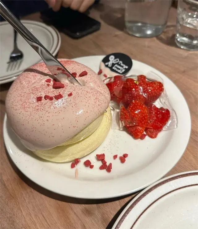 觀塘世貿大樓一樓,注意返有好多餐廳放嘅提示都可以搵到,疏乎厘做到外實內軟嘅感覺,即係咬落去有咬到蛋糕味,但係中間又好似有咬空氣嘅柔軟嘅感覺,幾驚喜,上邊嘅士多啤梨忌廉好香士多啤梨味,甜度就甜咗啲啲,但係cream味好香,搭配應景士多啤梨,仲攞咗一層透明嘅好似啫喱嘅嘢冚住佢哋,得意,pancake兩個人食好啲,因為個cream甜咗啲會有少少膩。