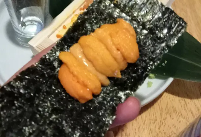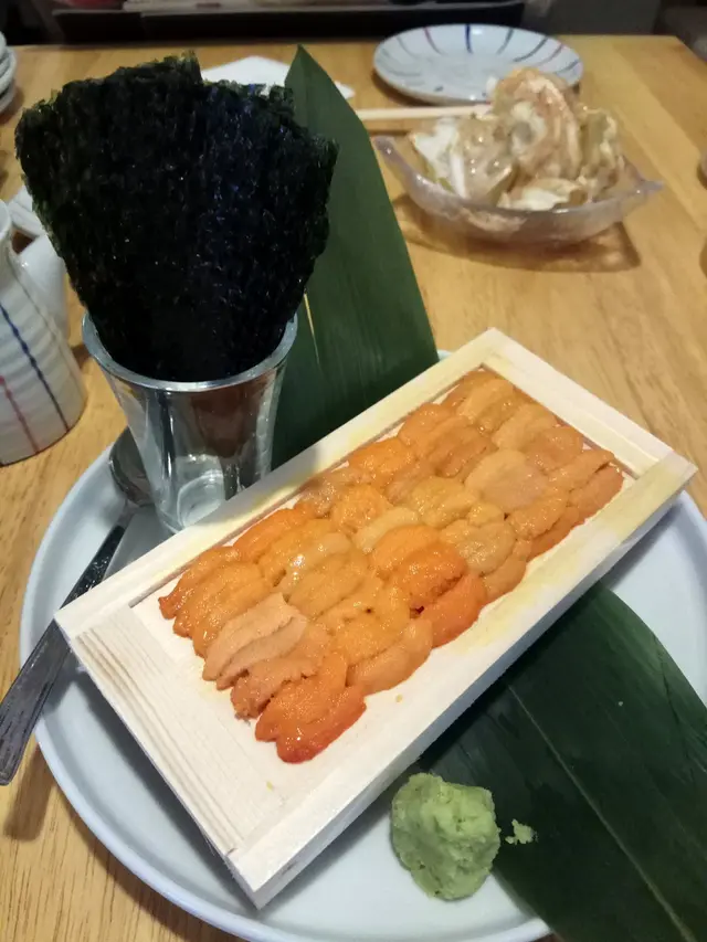雖然係免費, 但一啲都唔差, 除咗size細小小 ,海膽色澤金黃, 入口軟滑甜美, 淨食滑口, 亦加紫菜食則脆口, 兩種口感。