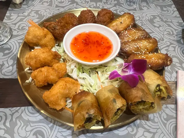 點咗泰式珍寶拼盆,裡面有好多不同嘅小食,色香味俱全,真係好吸引!每一樣都唔同,例如啲炸蝦球外脆內嫩,蝦肉鮮甜,配上啲甜酸醬,正。春卷炸得金黃香脆,裡面嘅餡料又香又濃,一啖接一啖停唔到!
