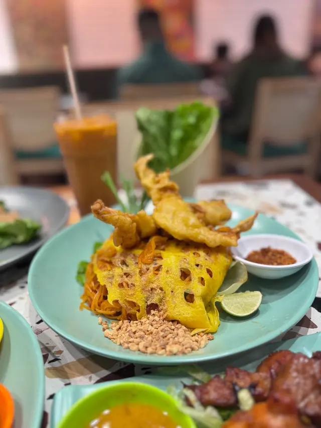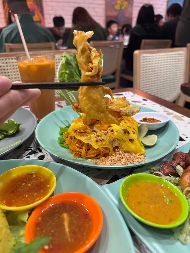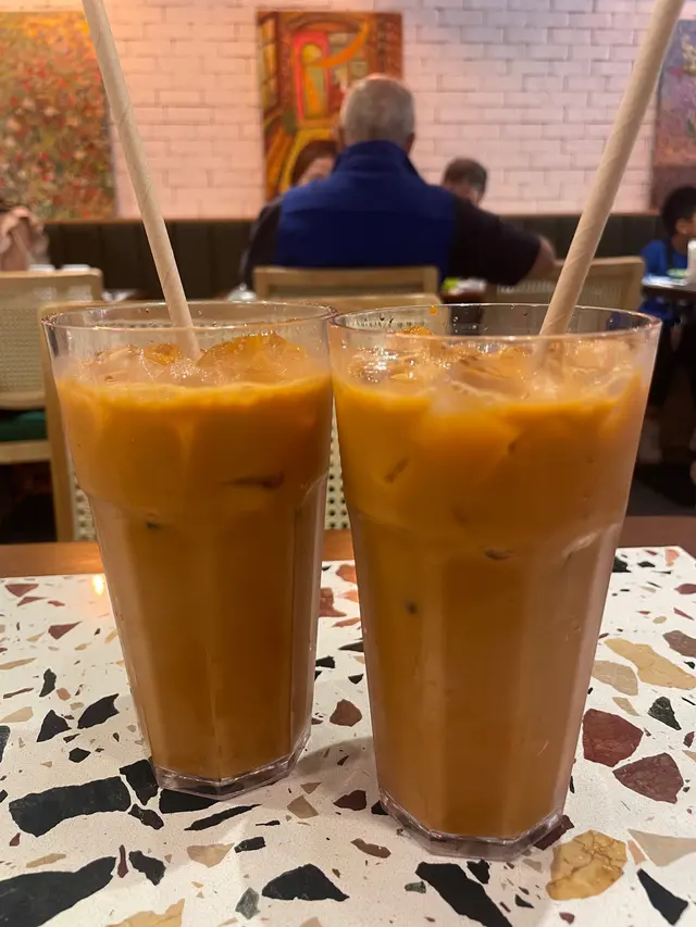 虎蝦大隻鮮甜,蛋白包住金邊粉煎得香脆,好欣賞佢入面撈埋小蝦乾,食落好有層次。冬蔭功湯酸辣醒神,凍奶茶一樣好飲,三代人食都啱口味。