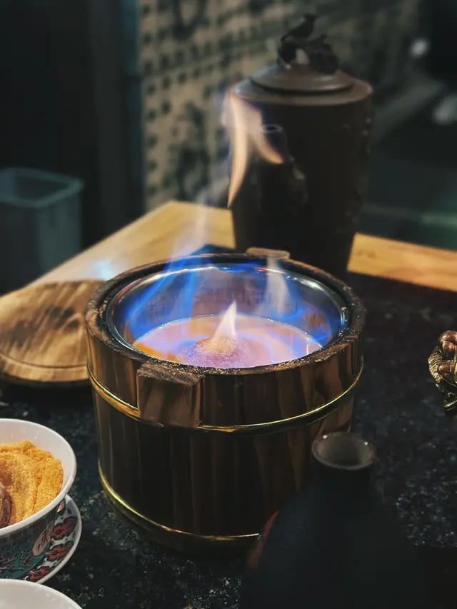 •會先落黃糖然後倒下酒在木桶豆腐花上,再用火槍點燃,就有藍藍的火燃燒着,就是打卡的時候到了!再一段時間後,豆腐花表面上的黃糖就會結成焦,就像吃焦糖燉蛋的感覺,還可以自己額外添加黃糖/糖水如想吃到更甜的豆腐花😎