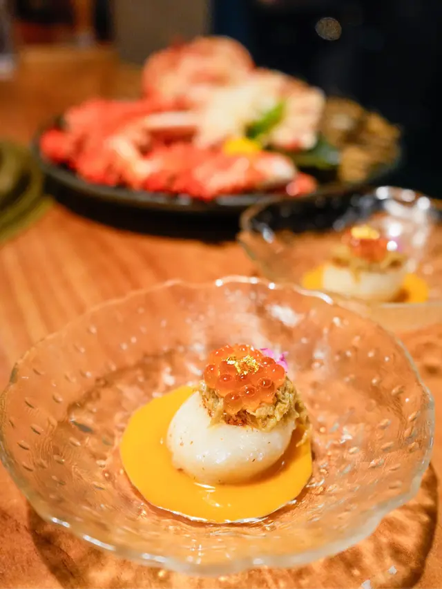 這次On-top有花咲蟹、魚子帆立貝、牛腸鍋 ,在正式開始放肆吃肉前,會先上每人一份帆立貝,上面有三文魚子跟蟹肉, 牛腸鍋當然是不能跟福岡當地比較,但腸子沒那麼油膩,也是不錯~最重要的是有一整隻拆好肉的花咲蟹,吃起來超方便,不用自己落手拆就突然覺得這蟹更美味了😂😂