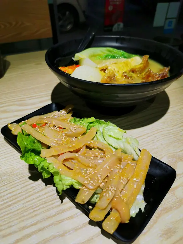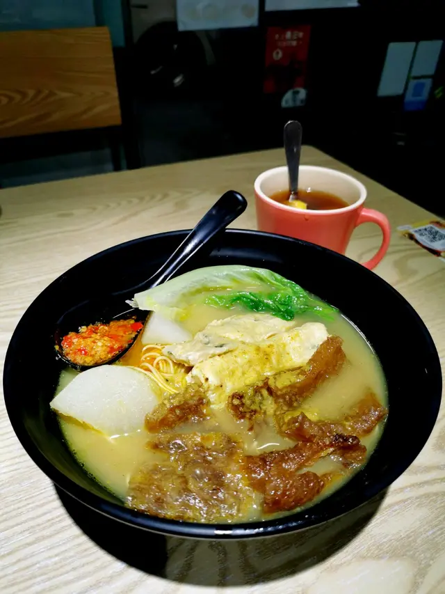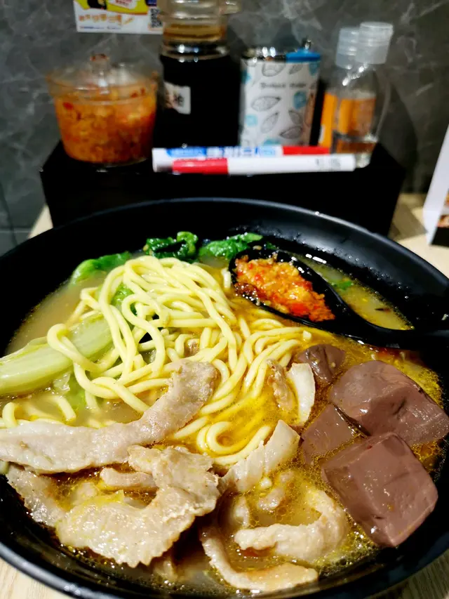 今次同朋友一人叫咗一碗3餸車仔麵,朋友揀咗沙嗲汁配豬頸肉、豬紅、生菜、油麵,我就揀咗咖哩汁配魚肉春卷、豬皮、蘿蔔、幼麵,兩款都有加辣醬,令個湯底好香蒜蓉味,而咖哩汁相對較辣,但食落幾過癮