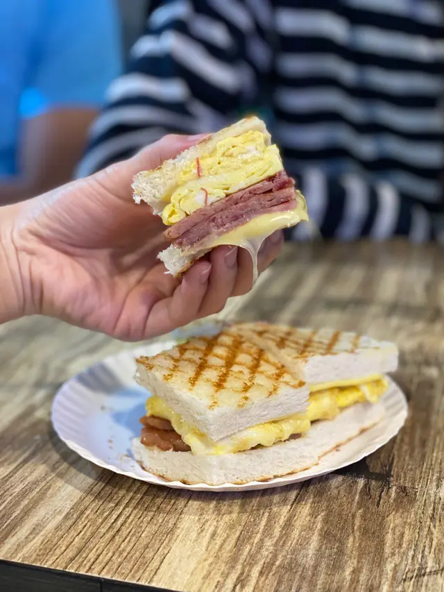 外層麵包搽咗牛油,烘到金黃色好吸引,薄身又脆脆哋好香口。即叫即整熱辣辣,夾住炒蛋、火腿、餐肉同埋芝士,蛋做到一層層好滑!