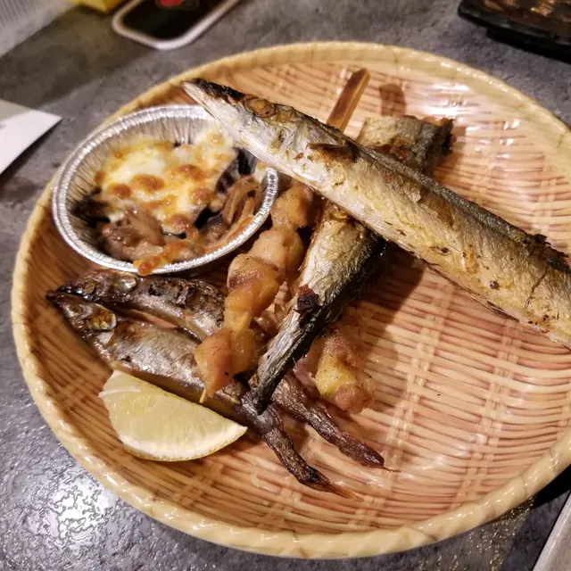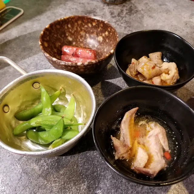 自製四小碟: 一口腸、枝豆、麻辣豬腸、蒜香雞翼尖,再加上鹽燒多春魚、鹽燒秋刀魚、蒜味單骨雞翼、鹽燒雞軟骨串,一次過滿足了貪吃但吃不多的我,特別喜愛蒜味單骨雞翼,蒜香味香濃,又剪成單骨,吃得超方便,大愛呀!