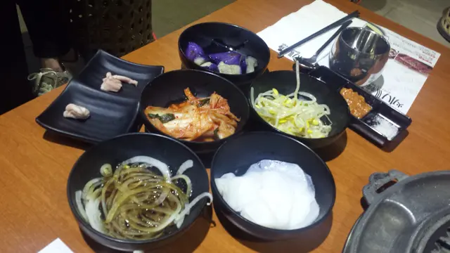 介紹一下檯面上的東東, 當然有韓式銀餐具及韓烤醬料, 分別有豉油, 韓辣醬及鹽。最左手邊還有兩小舊肥膏開爐用以代替油, 既天然又不浪費! 當然少不了韓國料理必有的前菜, 可是我不太好醃漬物, 好在友人鍾意食, 前菜有泡菜, 洋蔥, 茄子, 白蘿蔔及芽菜, 友人說除了茄子沒什麼味道外, 其他都好味, 提一提友人是可以refill的, 即是喜上眉梢, 哈!