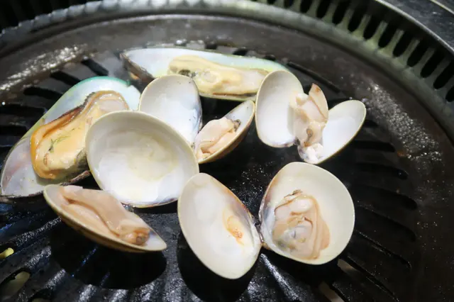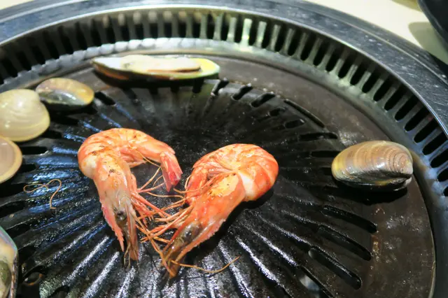 吃了刺身壽司後,我們便開始燒食物。先從燒海鮮入手,選了海中蝦、紐西蘭牛油青口及北海道活蜆。海中蝦很新鮮,肉質彈牙而一點也不「霉」,而且是當中最快熟的,輕輕燒了一會兒就已熟透了,兩隻放在更可以擺出一個心型,很可愛!紐西蘭牛油青口是有點失望的一個,沒有清除了應有要清除的部分,所以第一口吃下去感覺怪怪地。北海道活蜆也是很新鮮大隻的一個,雖然燒了好一陣子材熟透,蜆殻才打開,但內裏一點也不乾,還很彈牙鮮甜,所以我們都點了不少海中蝦跟北海道活蜆。