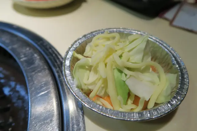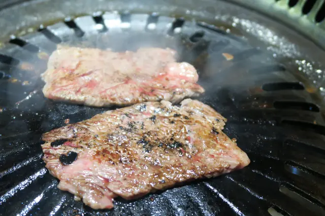 然後是燒牛肉的時間,先選了鹽燒安格斯一口牛、孜然安格斯一口牛及薄切燒汁牛肩胛肉眼。因為燒汁牛肩胛肉眼是薄切,所以輕輕燒一燒就已經熟了,肉汁豐富而肉質嫩滑但不肥膩,是一個不錯的牛肉。而鹽燒安格斯一口牛及孜然安格斯一口牛因為是正方體的關係,雖然細細粒但也有一定的厚度,所以燒的時間也比較久,而到燒熟的時候,因為其中一個也只是加了調味粉而不是在肉質方面調味,所以吃下去味道差不多,但亦很滋味。