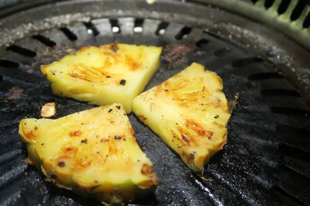 吃了那麼多肉,點了一個千島芝士燒野菜及菠蘿。千島芝士單配燒野菜會因為醬汁太多的關係而有點膩,但用它來蘸著雞豬肉來吃,效果也不錯,也有喜出望外的感覺。而燒菠蘿當然是我最愛的其中一樣,微焦的外表、溫暖的菠蘿及鮮甜的菠蘿汁實在是我的最愛!