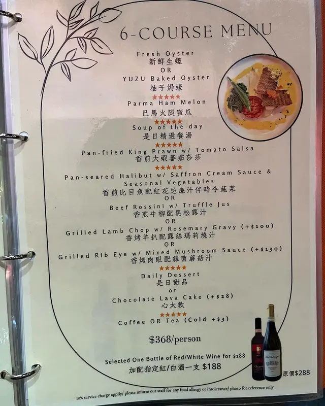 除咗食六道菜,都有散叫的選擇。lunch Menu 大概$100,打算下次試吓,如果真係同今次晚餐水準一樣,咁就真係幾值得食。