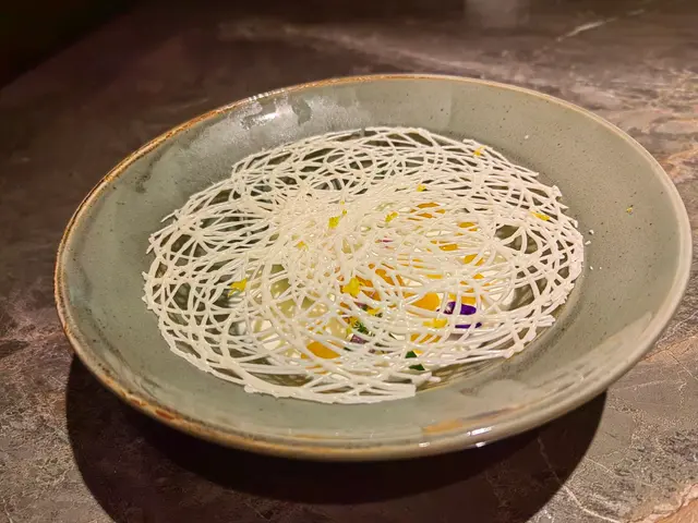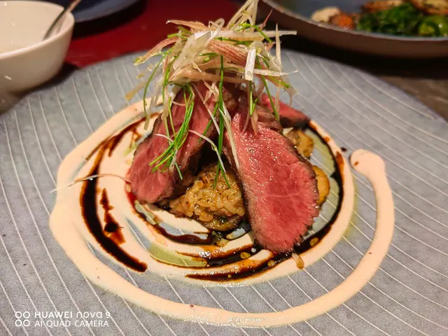 一道「日本A5雪室熟成和牛」端上桌面。由於稀有的關係,牛的部位會不定期變更,視乎來貨。雪室和牛逐塊疊高,底層是煎脆的日本米飯糰及法式手指薯,豆腐蓉繞在周邊點綴一番。醬汁以日本豆腐及黑蒜調成,連牛肉面的蔥絲也以京蔥、乾蔥及芽蔥三種組成,帶出不同口感。