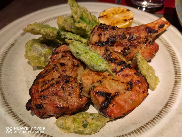 另外一道主菜為希臘乳酪醃法國牛仔肉,相對熟成和牛此道菜肉質較結實,牛仔肉則充滿油香,乳酪的酸度平衡牛仔肉的油膩感;加上野菜天婦羅配菜,正正代表餐廳的法日風格。