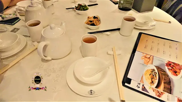 瓷杯、瓷碟均印有酒家中、英文名稱圖案,清雅秀麗,散發一種貴重氣質。